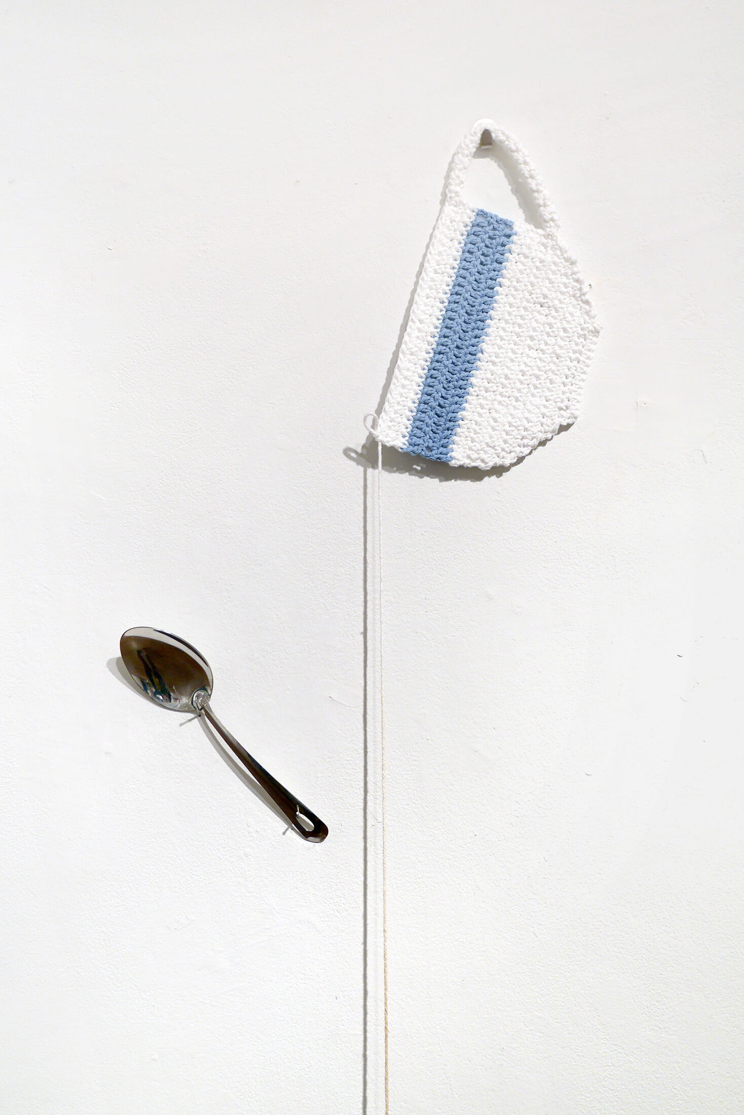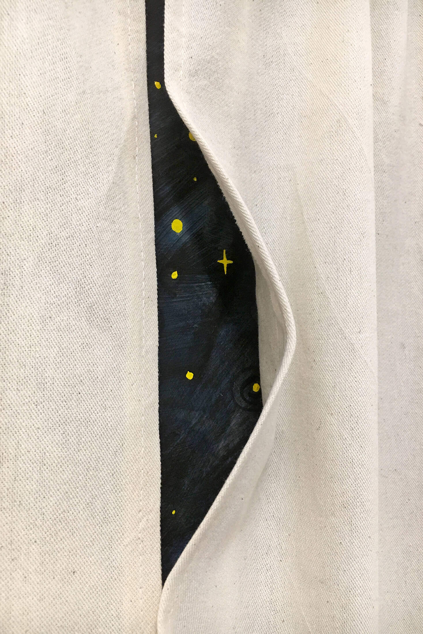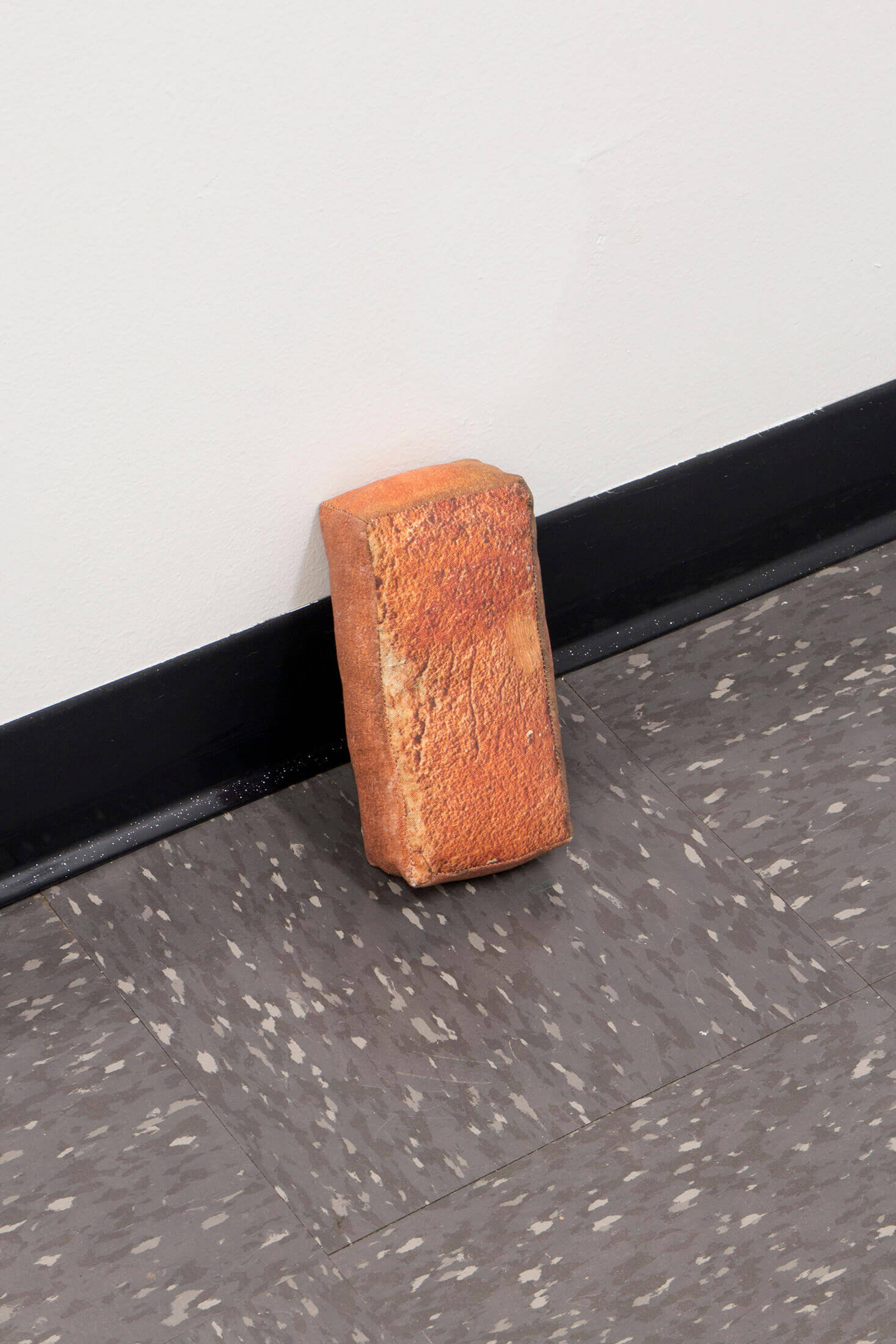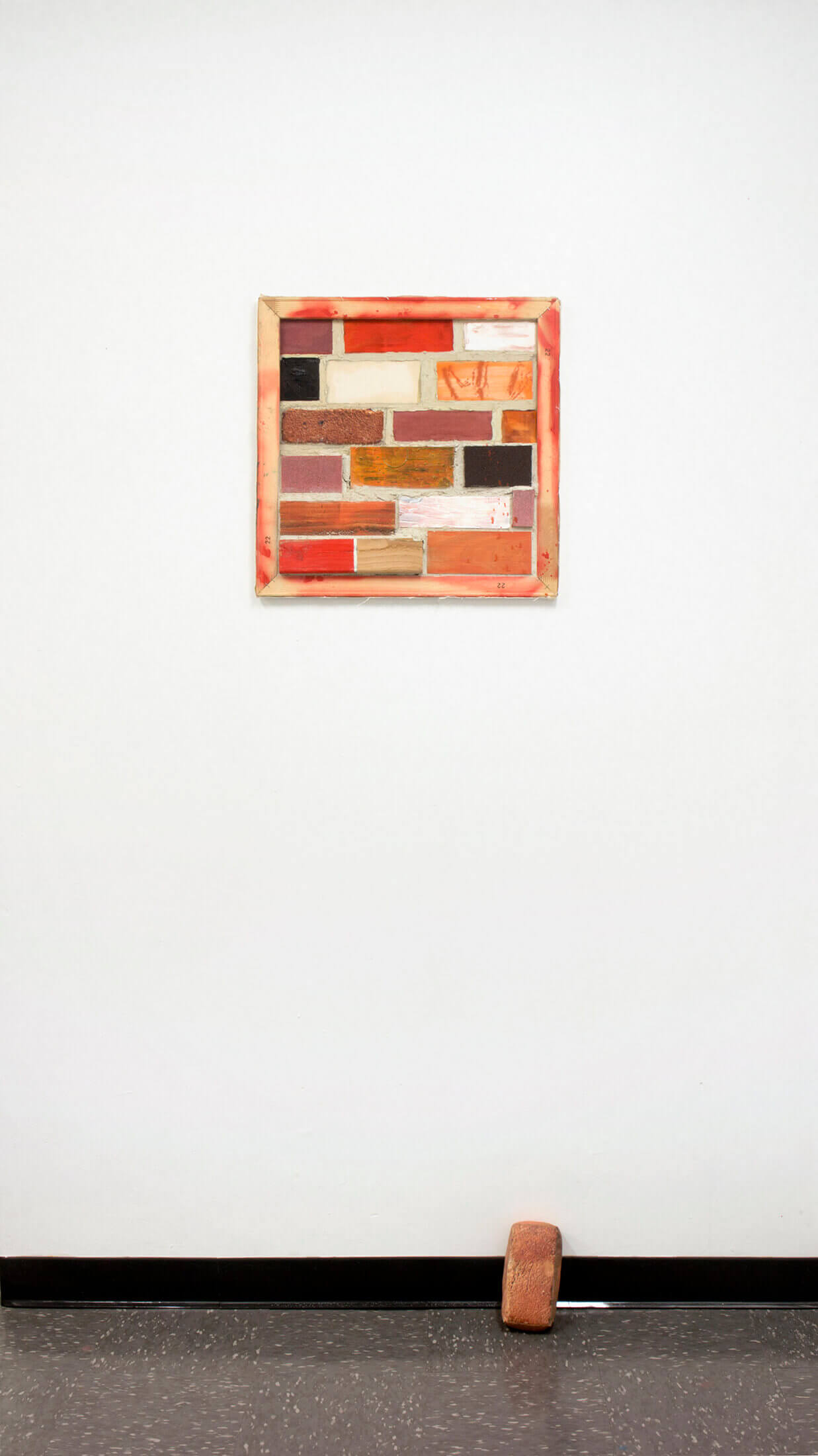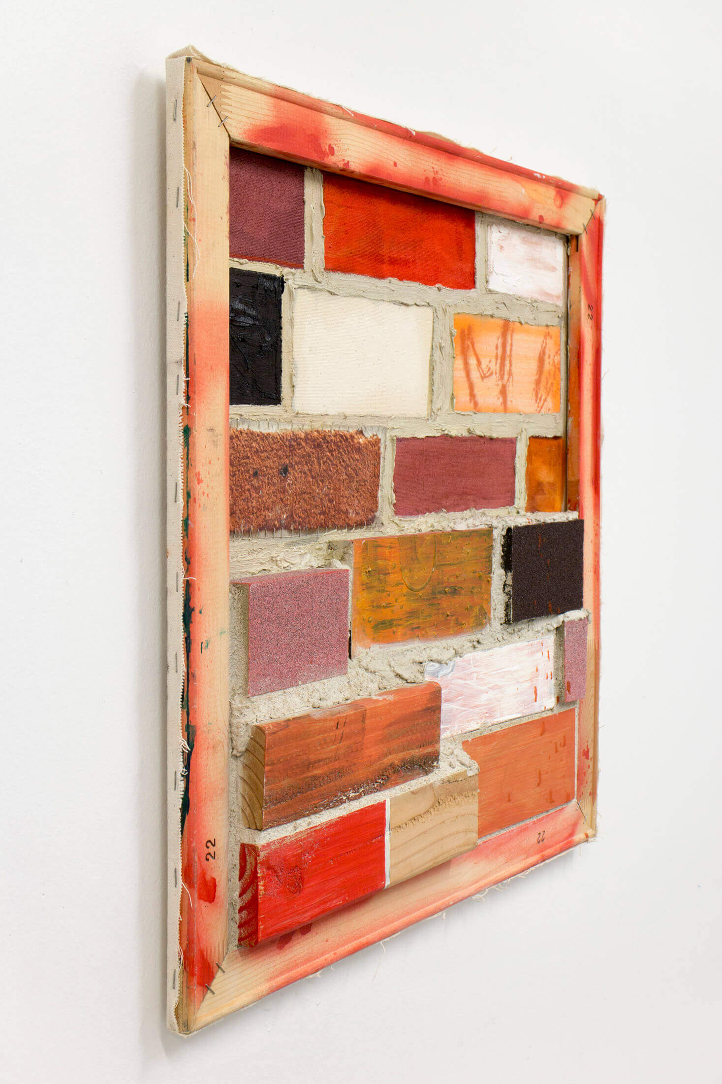 Stretcher Bond, oil and acrylic paint, mortar, wood, sanding blocks, printed fabric and thread on canvas, stretcher bars, fabric and polyfill, 22” x 22”, 2018