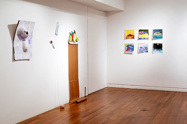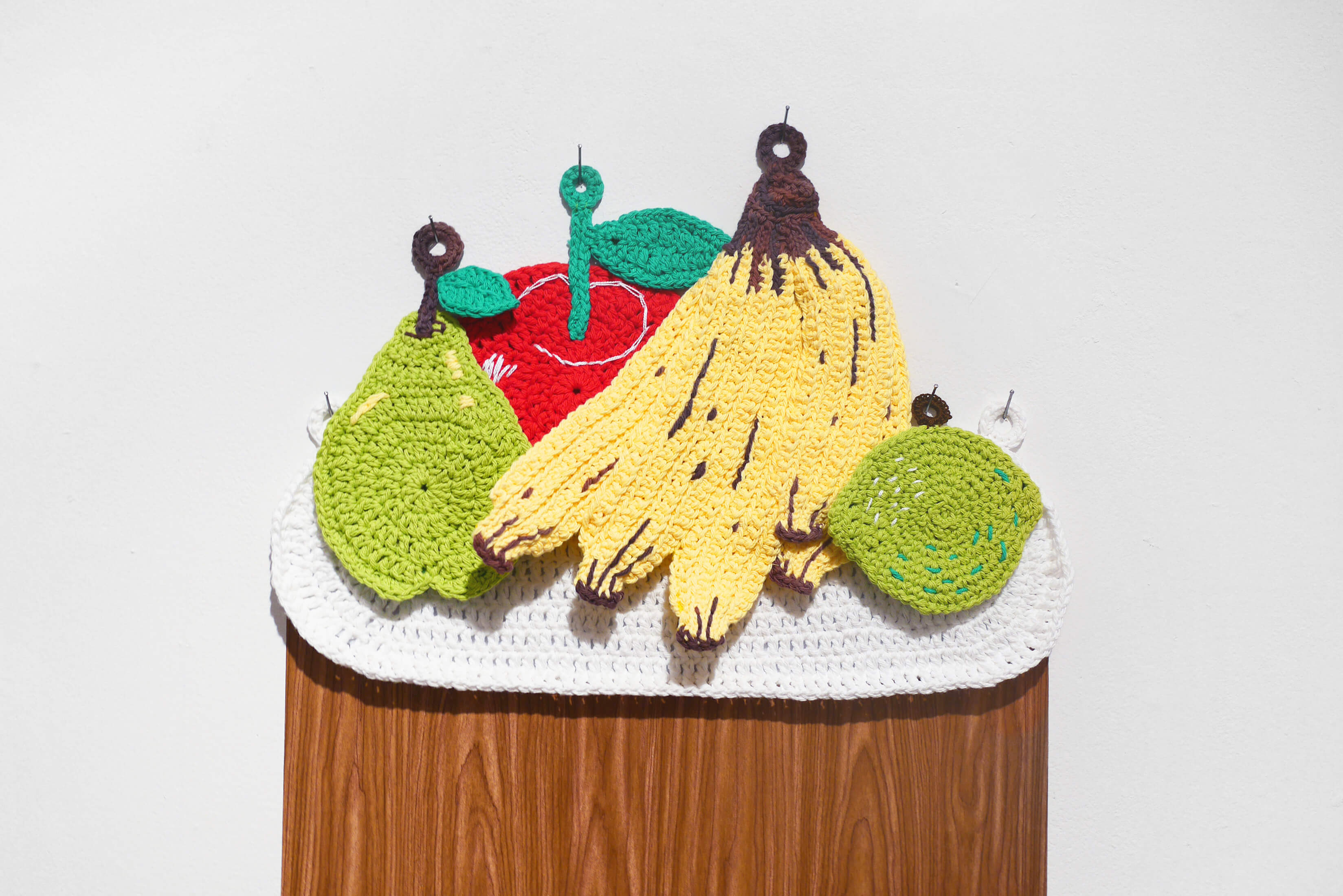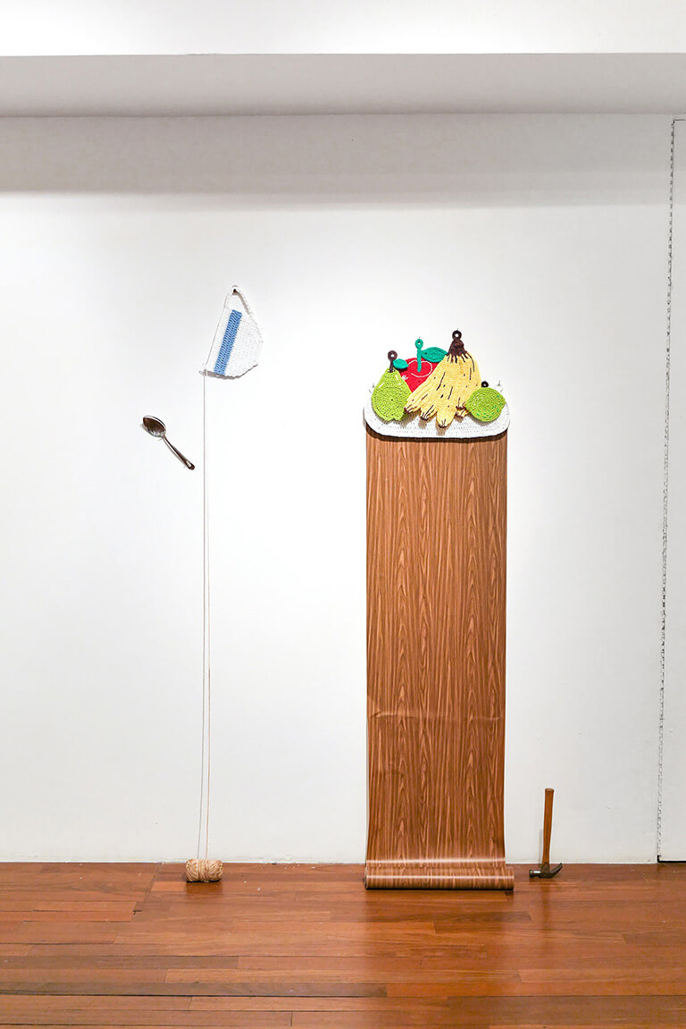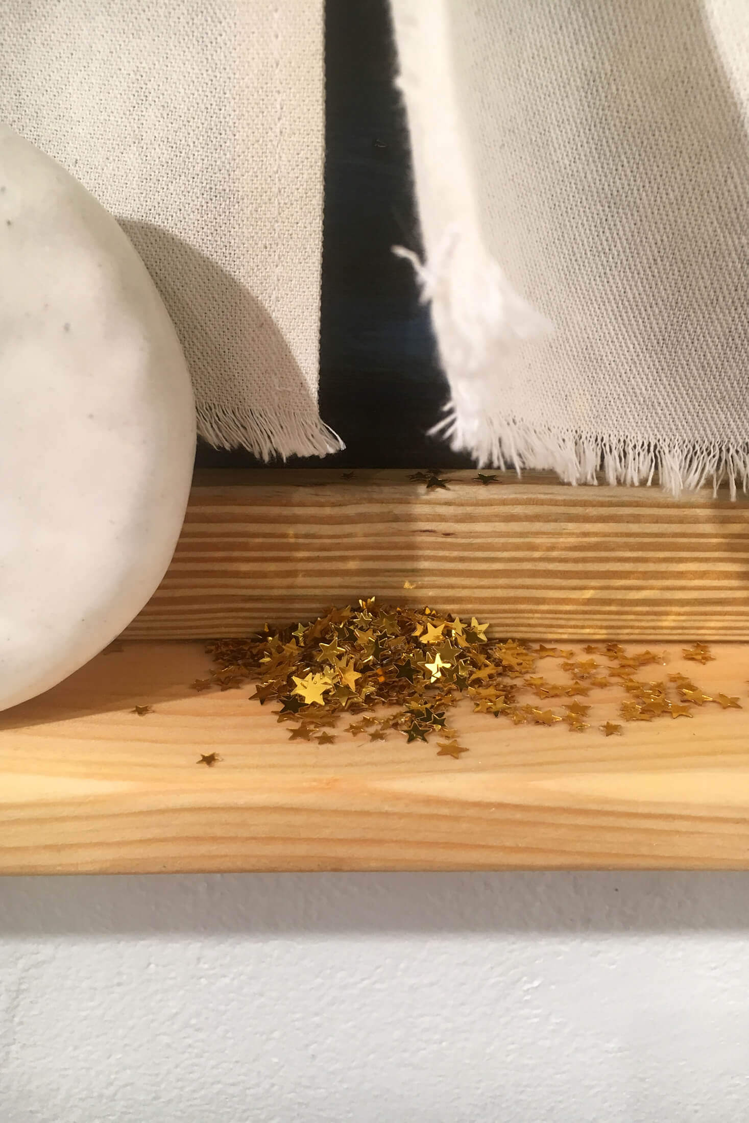 Wind Ow!, wood, polymer clay, glazed ceramic, artificial flowers, star confetti, acrylic on masonite, 26” x 24”, 2018